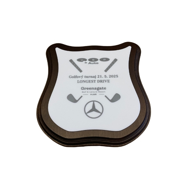 Masivní lipová frézovaná deska ve tvaru erbu. Ve středu desky je umístěn pokovený plast, na který se aplikuje laserové gravírování. Vrchní strana erbu tmavě hnědá, pokovený plast ve variantě bronz – stříbro – zlato. Taktéž provedení na černý nebo bílý akryl.